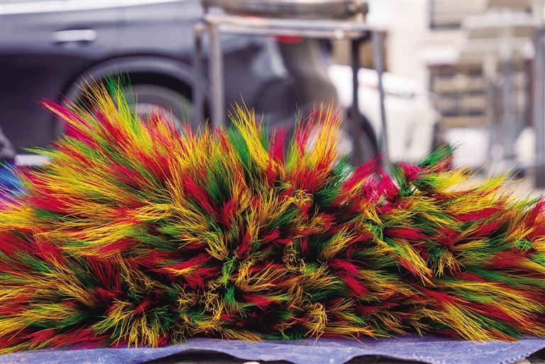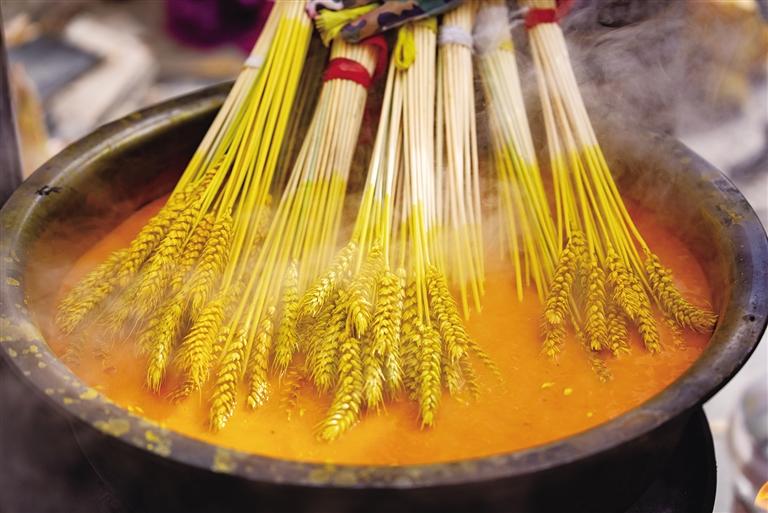 從金黃到色彩斑斕,“羅薩梅朵”的制作需要經(jīng)過收割、曬干、上色等數(shù)道工序,這是桑木村村民傳承至今的手藝。熱氣騰騰的顏料鍋旁,年輕的媳婦正在煮顏料;曬干的“羅薩梅朵”堆在一旁,一位奶奶和她的孫子正在有序捆綁。廣場(chǎng)上,年齡最大的村民近70歲,最小的12歲,年輕人從老一輩手中接過了文化傳承的接力棒。