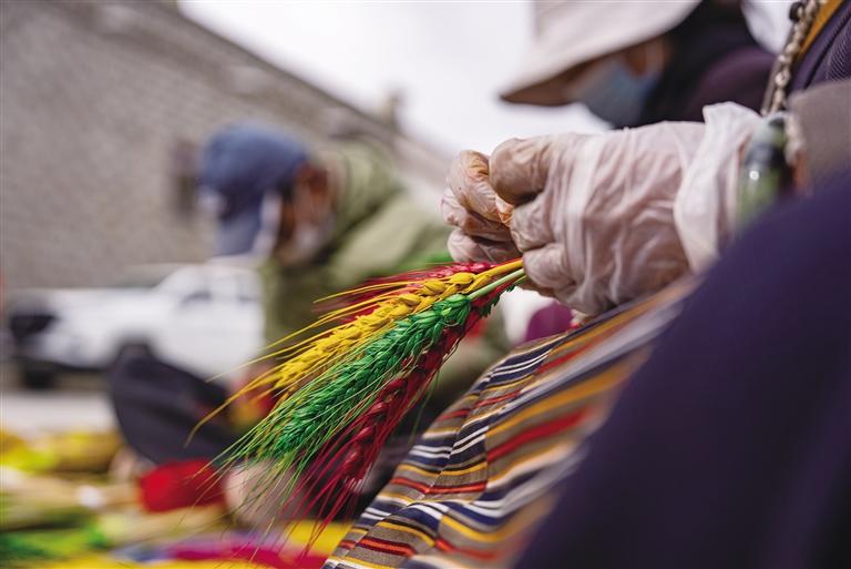 每年12月起,桑木村處處可見“羅薩梅朵”。清晨,天還未亮,村民們就已忙碌起來。有人將制作好的“羅薩梅朵”打包送往拉薩市區(qū)售賣,有人則繼續(xù)為剩下的麥穗和青稞穗上色、曬干?!拔覐男】粗L(zhǎng)輩們制作‘羅薩梅朵’,7歲就開始幫忙捆綁,20歲開始獨(dú)立制作。每到這個(gè)時(shí)候,我就知道新年快到了?!?4歲的村民卓瑪次仁回憶道。