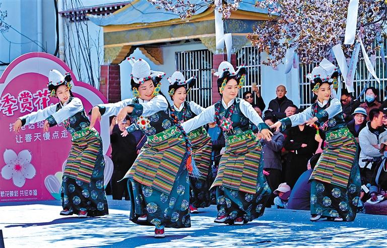 3月27日,“繁花映彩 共繪幸?!笔讓梦幕囆g(shù)周暨 “3·28”西藏百萬(wàn)農(nóng)奴解放紀(jì)念日活動(dòng)在拉薩市城關(guān)區(qū)軍民路開(kāi)幕。圖為活動(dòng)現(xiàn)場(chǎng)歌舞表演。記者 王敏 攝