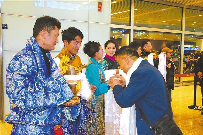 這個(gè)舉動,讓來自云南、廣東、安徽等地的100多名游客切身體驗(yàn)了一番別具西藏特色的歡迎儀式。“沒想到一下飛機(jī)就感受到了藏族同胞們的熱情,身體的疲憊感瞬間消散了?!睆V東游客彭帆開心地說道。