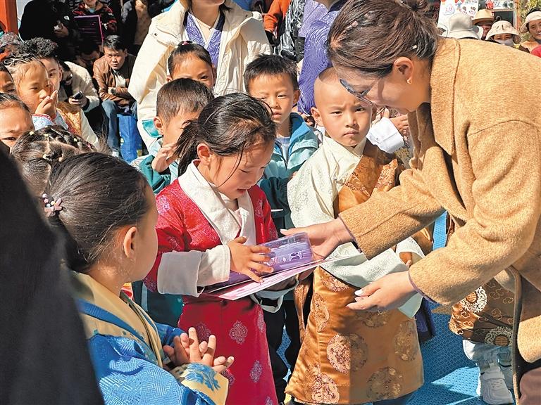 圖為工作人員為答對(duì)問(wèn)題的小朋友頒發(fā)獎(jiǎng)品。記者 拉巴桑姆 攝