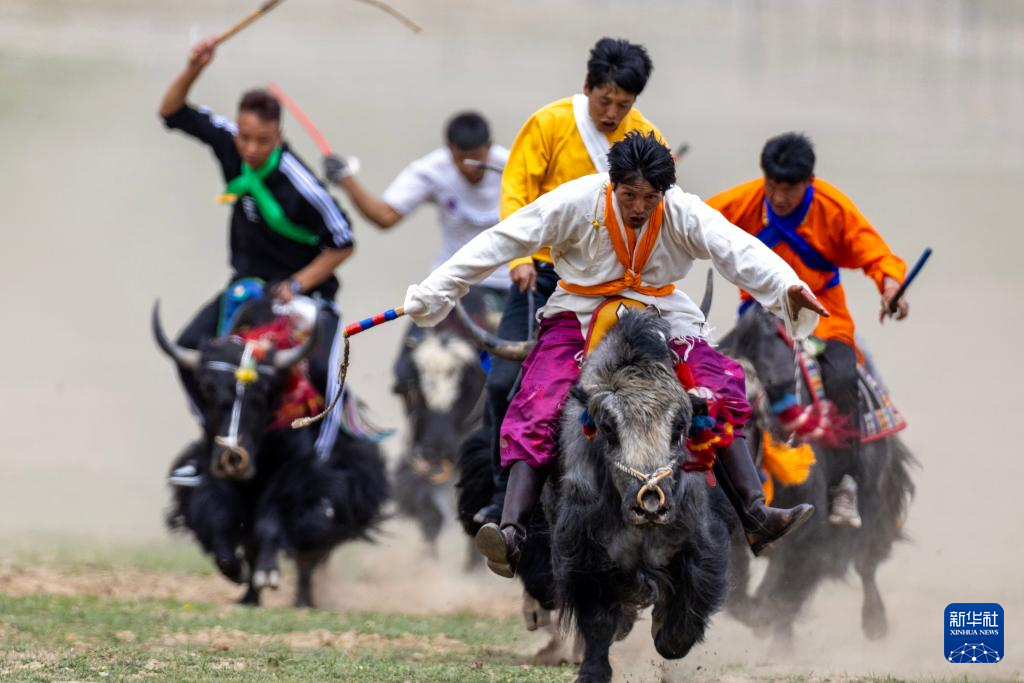 5月29日,當(dāng)?shù)剞r(nóng)牧民群眾在賽牦牛比賽中。新華社記者 丁增尼達(dá) 攝