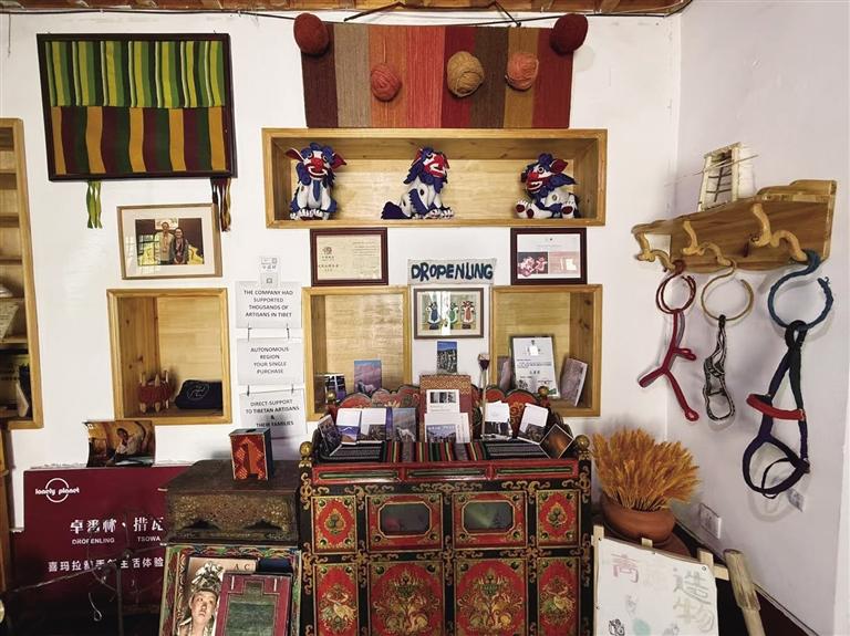 進(jìn)入卓番林,只見狹長的店面內(nèi)琳瑯滿目地擺著各類富有藏元素的物件,里側(cè)的木質(zhì)貨架上整齊掛著多條不同顏色和格紋樣式的織物,貨架上方擺放著展示手工編織過程的照片。工作人員告訴記者,這些都是可售賣的,除此之外,游客來到這里,還可以體驗酥油香皂、酥油唇膏、藏式刺繡等手工DIY。