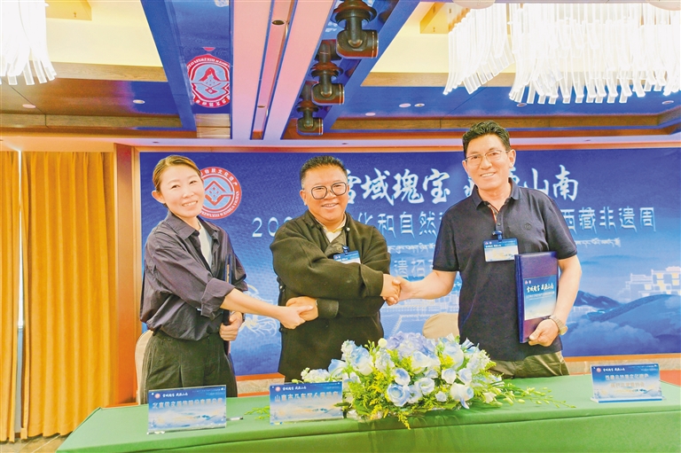 在全區(qū)非遺招商引資及項(xiàng)目簽約會(huì)上,4家企業(yè)負(fù)責(zé)人分別介紹公司發(fā)展歷程、市場前景、合作意向、未來計(jì)劃等情況。乃東區(qū)人民政府、乃東區(qū)文化和旅游局、西藏卓番林文化有限公司、北京依文服飾股份有限公司等一同簽訂了項(xiàng)目合作協(xié)議。