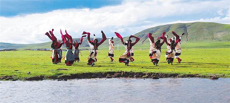 近年來,那曲文旅局以那曲傳統(tǒng)鍋莊舞展演為突破口,進一步推進那曲優(yōu)秀傳統(tǒng)文化創(chuàng)造性轉(zhuǎn)化和創(chuàng)新性發(fā)展,全力打響那曲鍋莊舞品牌。 圖為那曲市群眾藝術(shù)鍋莊隊隊員在草原上跳鍋莊舞。(那曲市文旅局非遺處提供)