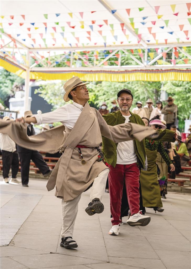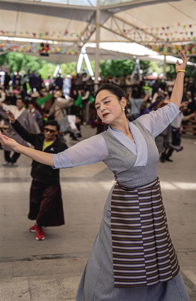 當?shù)谝豢|晨光輕柔地灑在拉薩宗角祿康公園,鍋莊舞的旋律如同靈動的精靈,每日都會準時在公園響起。