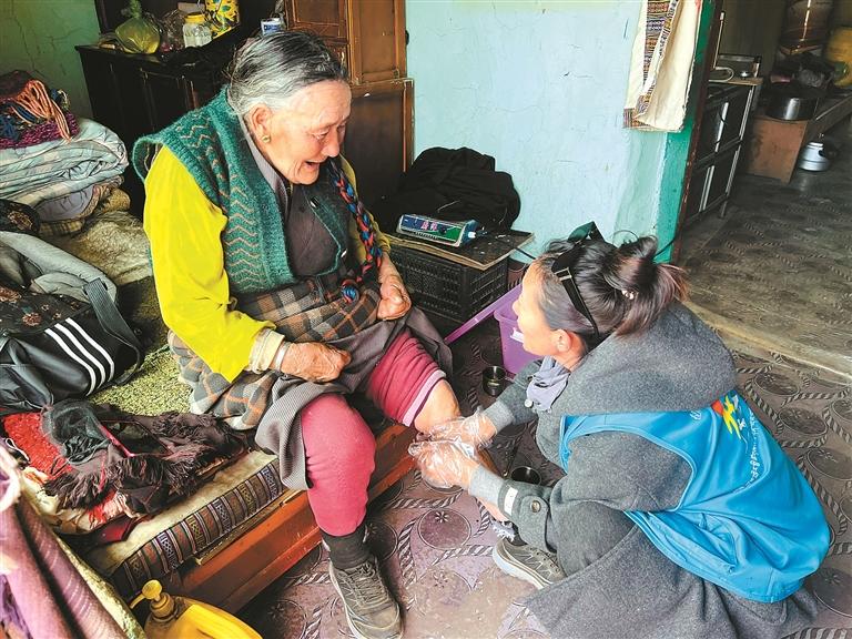 清晨的陽光灑在林周縣春堆鄉(xiāng)卡東村的土路上,林周縣民政服務(wù)站工作人員旦增旺姆背著裝滿蔬菜和藥品的布袋,熟門熟路地走進(jìn)仁增拉卓老人的院子?!鞍尷?,今天給您帶了新鮮的蘿卜,再把降壓藥給您續(xù)上?!?3歲的仁增拉卓顫巍巍迎上來,拉著旦增旺姆的手笑得眼角堆起皺紋——這樣的清晨探望,早已成為老人日常生活里的“定心丸”。