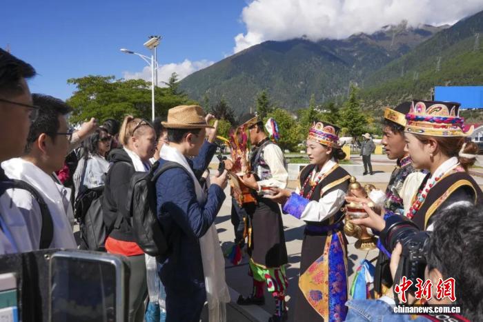 圖為林芝市民為嘉賓敬青稞酒。林芝市文化和旅游局 供圖