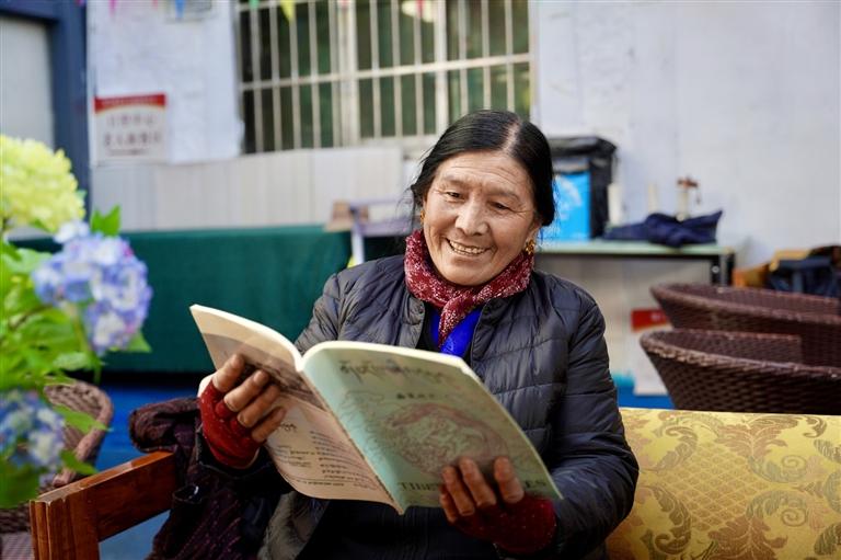 老人在日間照料中心看書。圖/記者 貢曲羅杰