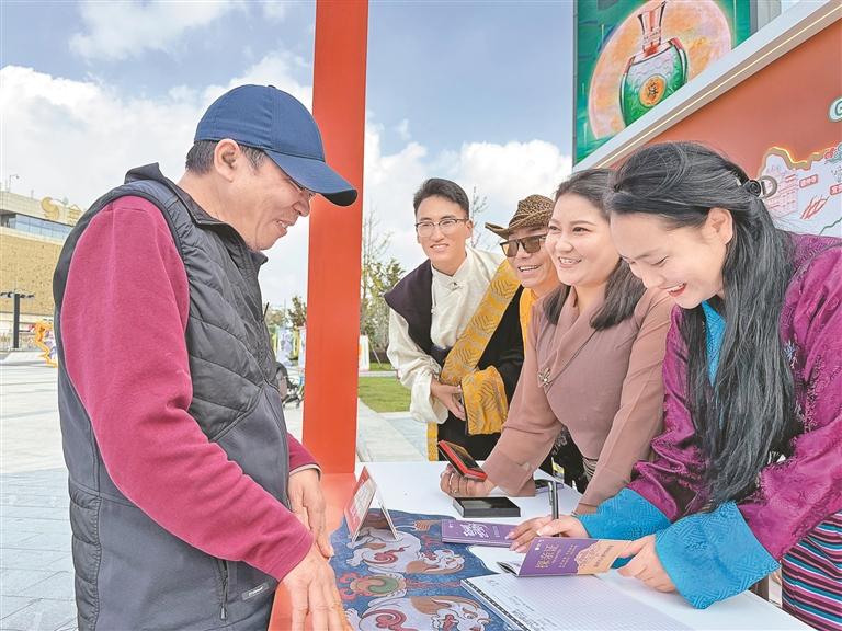 “萬(wàn)人墨竹探親游”活動(dòng)的探親證發(fā)放處人潮擁擠,排隊(duì)申請(qǐng)領(lǐng)證的市民絡(luò)繹不絕?!拔覀儨?zhǔn)備了1萬(wàn)本免費(fèi)發(fā)放的探親證,探親證上詳細(xì)介紹了紅色文化游、藍(lán)色康養(yǎng)游、綠色生態(tài)游、文化探秘游、墨竹深度游精品線路的詳細(xì)內(nèi)容供大家選擇。屆時(shí),我們將準(zhǔn)備好香甜的青稞酒、潔白的哈達(dá)、美味的藏餐等候咱們南京的兄弟姐妹回雪域高原的墨竹家中看看、坐坐?!蹦窆たh文化旅游公司負(fù)責(zé)人扎西措姆在探親證發(fā)放現(xiàn)場(chǎng)介紹道。