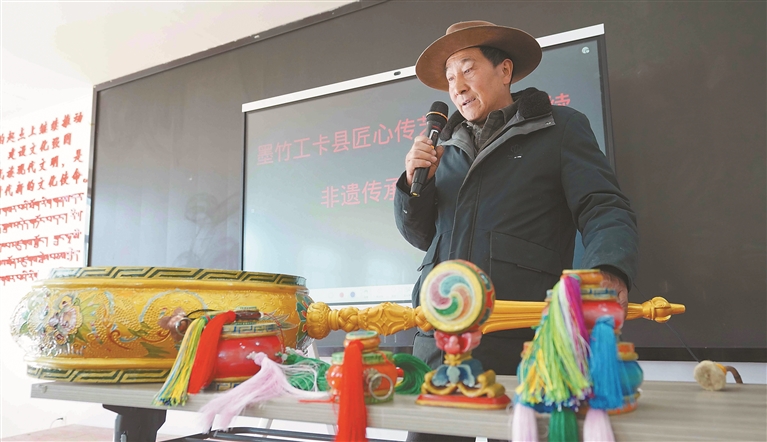 圖為墨竹工卡縣非遺代表性傳承人在展示非遺成果。記者 格桑倫珠 攝