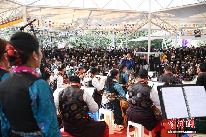 12月20日,為熱烈慶祝西藏自治區(qū)成立60周年,由西藏自治區(qū)文化和旅游廳主辦的格?;ㄑ莩黾尽履辍拔覀兊墓?jié)日 群星薈萃”群眾音樂(lè)會(huì)在拉薩宗角祿康公園精彩上演。音樂(lè)會(huì)節(jié)目豐富多樣,涵蓋民樂(lè)合奏、少兒藏戲、獨(dú)唱重唱等多種形式。傳統(tǒng)韻味與時(shí)代氣息交融,各族群眾以歡歌贊頌發(fā)展巨變,共迎美好新年。圖為群眾音樂(lè)會(huì)現(xiàn)場(chǎng)。中新社記者 貢嘎來(lái)松 攝