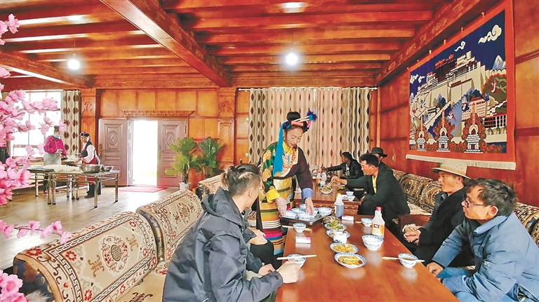 作為自治區(qū)級(jí)非遺傳承人、芒康縣“婦女致富帶頭人”的卓瑪拉姆,于2010年開(kāi)辦鹽井果拉叢農(nóng)家樂(lè),憑借著正宗的加加面風(fēng)味和熱情的服務(wù),逐漸積累了口碑。2012年,在各級(jí)政府的支持下,她采用“民族特色餐飲+鄉(xiāng)村旅游接待”的經(jīng)營(yíng)模式,生意日益紅火。2017年,通過(guò)貸款300萬(wàn)元、自籌160萬(wàn)元翻建了農(nóng)家樂(lè),將其升級(jí)為綜合型的民族特色餐飲店,經(jīng)營(yíng)規(guī)模大幅擴(kuò)大,最多時(shí)日接待游客達(dá)300余人。