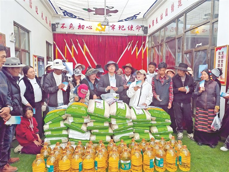 圖為駐村工作隊(duì)為牧民群眾宣講《西藏自治區(qū)農(nóng)牧民享受財(cái)政補(bǔ)助優(yōu)惠政策明白卡(2025年版)》,并發(fā)放慰問品。記者 王雨霏 攝