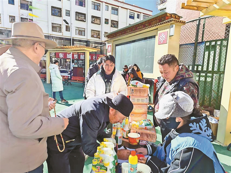 隨著春節(jié)與藏歷新年的臨近,城關(guān)區(qū)奪底街道振興社區(qū)處處洋溢著喜慶的氛圍,村民們都在精心籌備迎接“雙節(jié)”的到來(lái)。日前,社區(qū)以“黨建引領(lǐng)聚民生 三大節(jié)日同歡慶”為主題,組織轄區(qū)居民聆聽(tīng)宣講、觀賞歌舞、齊跳鍋莊,并向困難群眾送上米、面、油等慰問(wèn)物資。