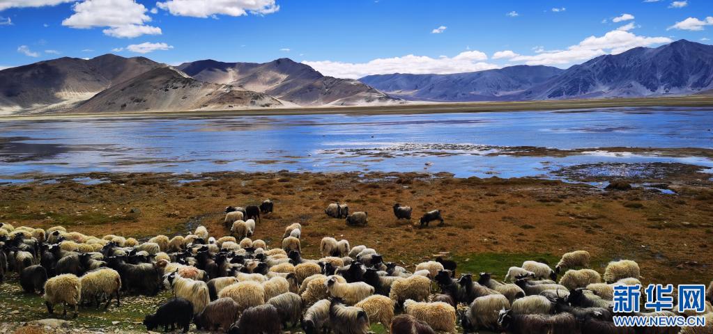 羊群經(jīng)過西藏定結(jié)縣一處湖邊的草地(5月13日攝,手機(jī)照片)。新華社記者 沈虹冰 攝