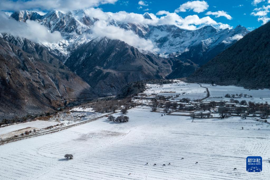 西藏林芝市米林縣派鎮(zhèn)雪景(1月14日攝,無人機(jī)照片)。新華社發(fā)(董志雄 攝)