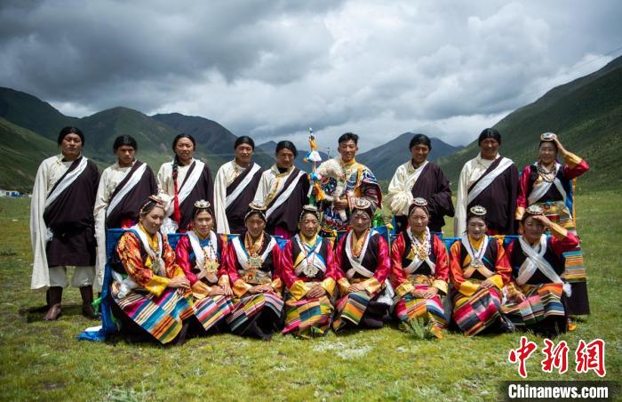 28歲藏族小伙尼瑪(后排右四)與跳直孔普堆巴宣舞的牧民們?!⒅铱?攝