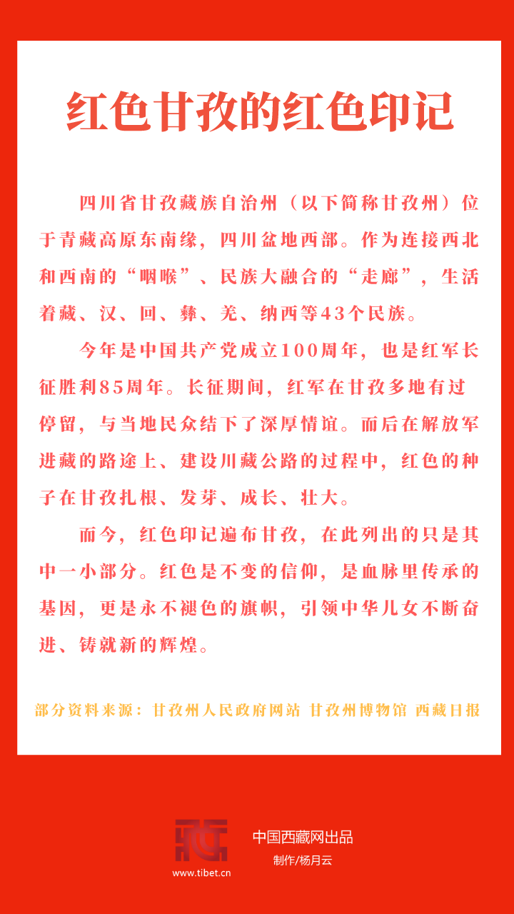而今,紅色印記遍布甘孜,在此列出的只是其中一小部分。紅色是不變的信仰,是血脈里傳承的基因,更是永不褪色的旗幟,引領中華兒女不斷奮進、鑄就新的輝煌。