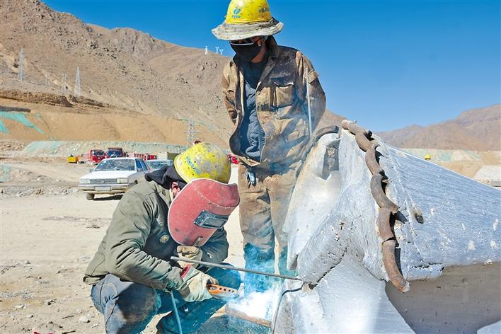 施工人員在修理機(jī)器。記者 陳林 扎西頓珠 攝