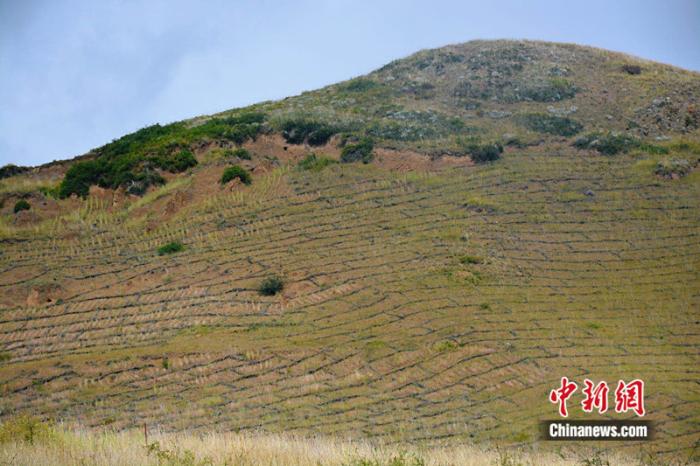 走進四川省阿壩州若爾蓋縣轄曼鎮(zhèn)西倉村治沙點,山坡上巨大的“棋盤”格外醒目。縣林草局生態(tài)修復股助理工程師涂勝介紹,這是用于治理草原沙化的高山柳沙障。