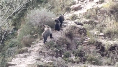黑豹野生動物保護站站長李理介紹:“我們傍晚5點左右架設好設備, 6點30分左右就拍到藏棕熊了,當時非常興奮”。他說:“當時天馬上就黑了,山里忽然下起了冰渣子,藏棕熊就在樹林間若隱若現(xiàn),后來它跑到一個光禿禿的山下,它狀態(tài)很好,非常健壯。”很快,大家又發(fā)現(xiàn)了第二只。隊員們的衣服都被冰渣子打濕了,高山上非常冷,但還是給相機做好防水,拍下了這寶貴的畫面。第二天傍晚,還是在同一地點,前一天晚上觀測到的一只藏棕熊再次出現(xiàn),不過這次,它帶了兩只小熊。大公熊強壯而霸道,帶幼崽的母熊小心謹慎,小熊憨態(tài)可掬,都非??蓯?。