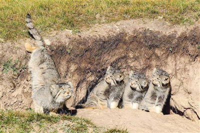 早上8時左右,暖洋洋的太陽灑在山坡上,這時五六十米外的洞穴中有了動靜,只見一種有著黃色眼睛和寬短耳朵,形似家貓的動物探頭探腦地出來了,原來是一只兔猻媽媽帶著三只小兔猻出來覓食。