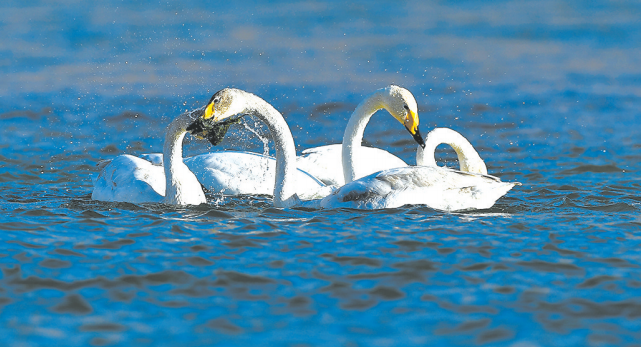 1月22日,大天鵝在青海省貴德縣境內(nèi)的黃河中覓食。隨著氣溫回暖,位于青海省海南藏族自治州貴德縣境內(nèi)的黃河成為大天鵝的越冬“港灣”,它們?cè)诖艘捠?、休憩,為冬日的黃河帶來(lái)勃勃生機(jī)。新華社記者 張宏祥 /攝