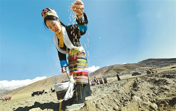 拉薩市墨竹工卡縣唐加鄉(xiāng)卓村四組群眾在田間撒下希望的種子。通訊員 洛桑克珠 記者 洛桑 攝