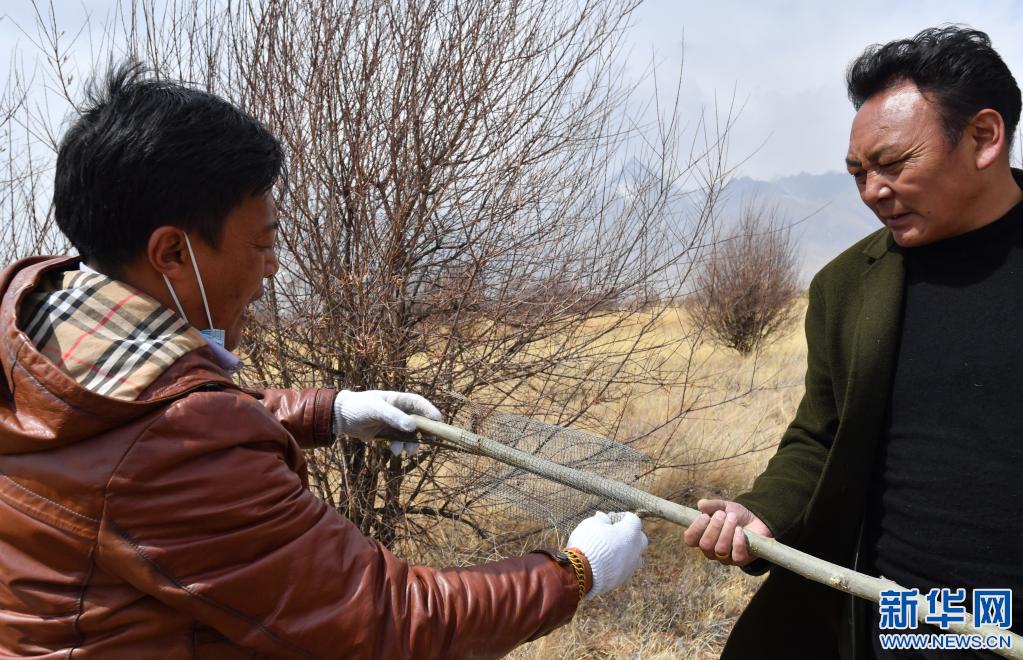 3月30日,索朗羅布(右)給樹裝上“防鼠套”。新華社記者 覺果 攝