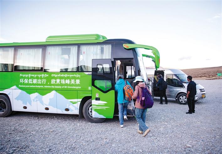 游客在珠穆朗瑪峰景區(qū)停車場轉(zhuǎn)乘環(huán)保客車(2019年5月16日攝)。珠穆朗瑪峰景區(qū)內(nèi)自2019年5月開始試運營清潔能源環(huán)保客車,以進一步平衡珠峰地區(qū)旅游發(fā)展與環(huán)境保護需要。新華社記者 孫非 攝