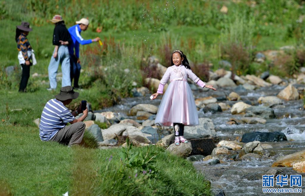 游人在達(dá)東村景區(qū)小溪邊玩耍(2019年7月20日攝)。新華社記者 張汝峰 攝