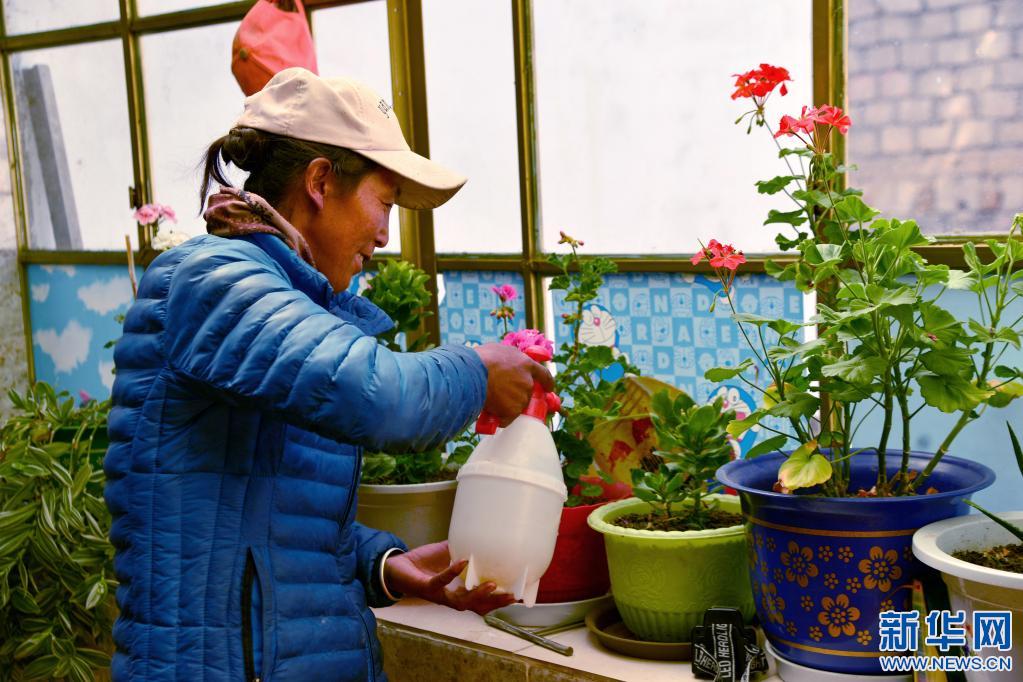 拉巴在新房?jī)?nèi)澆花(2020年10月14日攝)。新華社記者 田金文 攝
