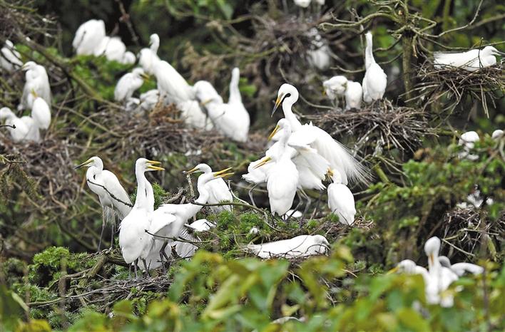 近期,在位于鄱陽湖畔的江西省南昌市新建區(qū)象山森林公園內(nèi),已安家筑巢的鷺鳥進入孵化哺育旺季。象山森林公園有著“鷺鳥王國”的美譽,每年都會吸引白鷺、蒼鷺、夜鷺等種類的鷺鳥飛抵棲息和繁衍后代。 白鷺在南昌市新建區(qū)象山森林公園內(nèi)棲息(5月18日攝)。新華社記者 萬象 攝