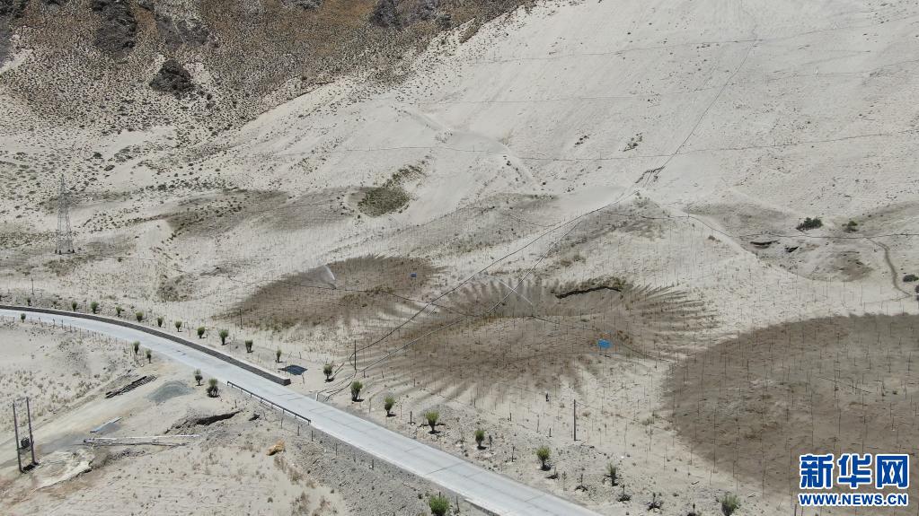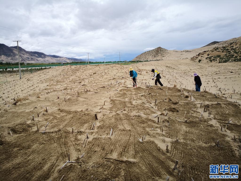 在山南市雅魯藏布江河谷地帶,村民們?cè)诰S護(hù)固沙用的草方格(2019年7月14日攝)。新華社發(fā)(資料照片)