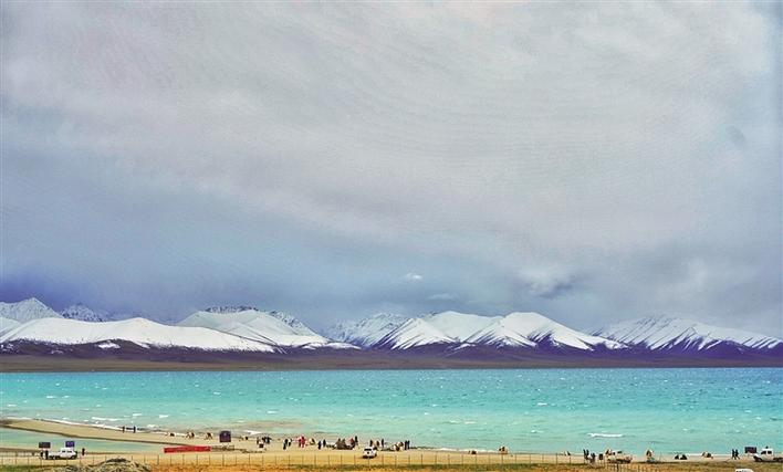 從羊八井出發(fā)至當雄縣,有一條向左的岔路,沿著這條路一直向前開約60公里,就能到達西藏最著名的景區(qū)之一——納木措。納木措,湖面海拔4718米,形狀近似長方形,東西長70多千米,南北寬30多千米,湖的東南部是直插云宵、終年積雪的念青唐古拉山主峰,清澈的湖水便來自念青唐古拉山融化的冰雪,北側(cè)則倚偎著和緩連綿的高原丘陵,廣闊的草原繞湖四周,似是將納木措小心翼翼地護在懷中。湖水顏色由罕見的碧藍與碧綠色相結合,是畫師都不易調(diào)出的顏色,遠遠望去,碧波粼粼的湖水與周圍的山脈、草原、藍天、白云交相輝映,令在場的人不禁連連感嘆仿佛置身于仙境之中。