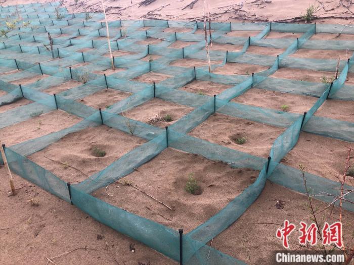 “傳統(tǒng)的方法是用廢樹枝等擺成方格等一定的形狀壓沙,里面再種上植物,效果很好但樹枝往往四五年就腐爛了;最近我們在嘗試推廣一種新型化學材料方格,成規(guī)??欤夷芫S持七到十年。”中國科學院西北生態(tài)資源研究院研究員常學向對記者說。