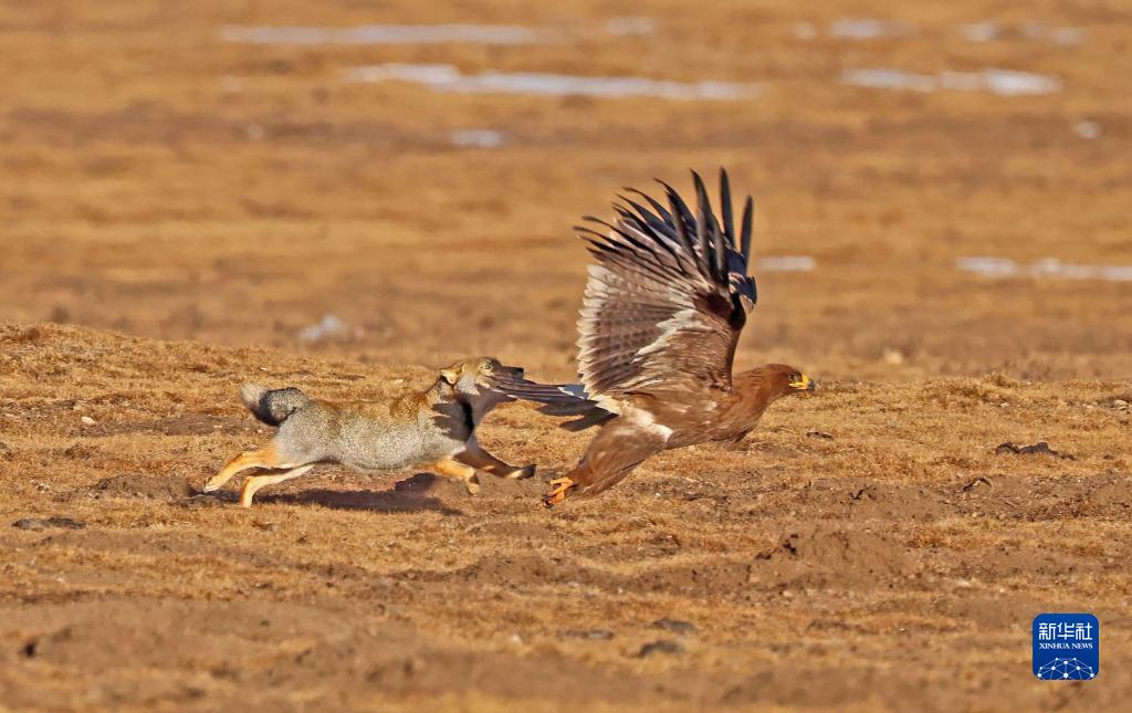 這是在四川省阿壩藏族羌族自治州若爾蓋縣境內(nèi)拍攝的一只藏狐追擊草原雕(2020年12月1日攝)。新華社 王冀川 攝