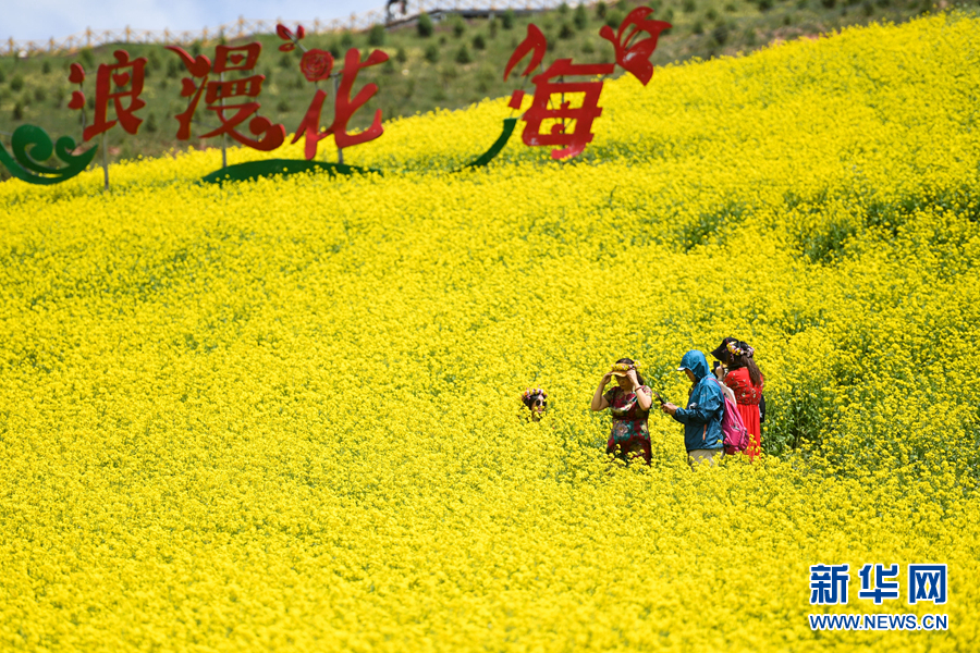 游客在海北藏族自治州門源回族自治縣的油菜花田中拍照。新華社記者 吳剛 攝