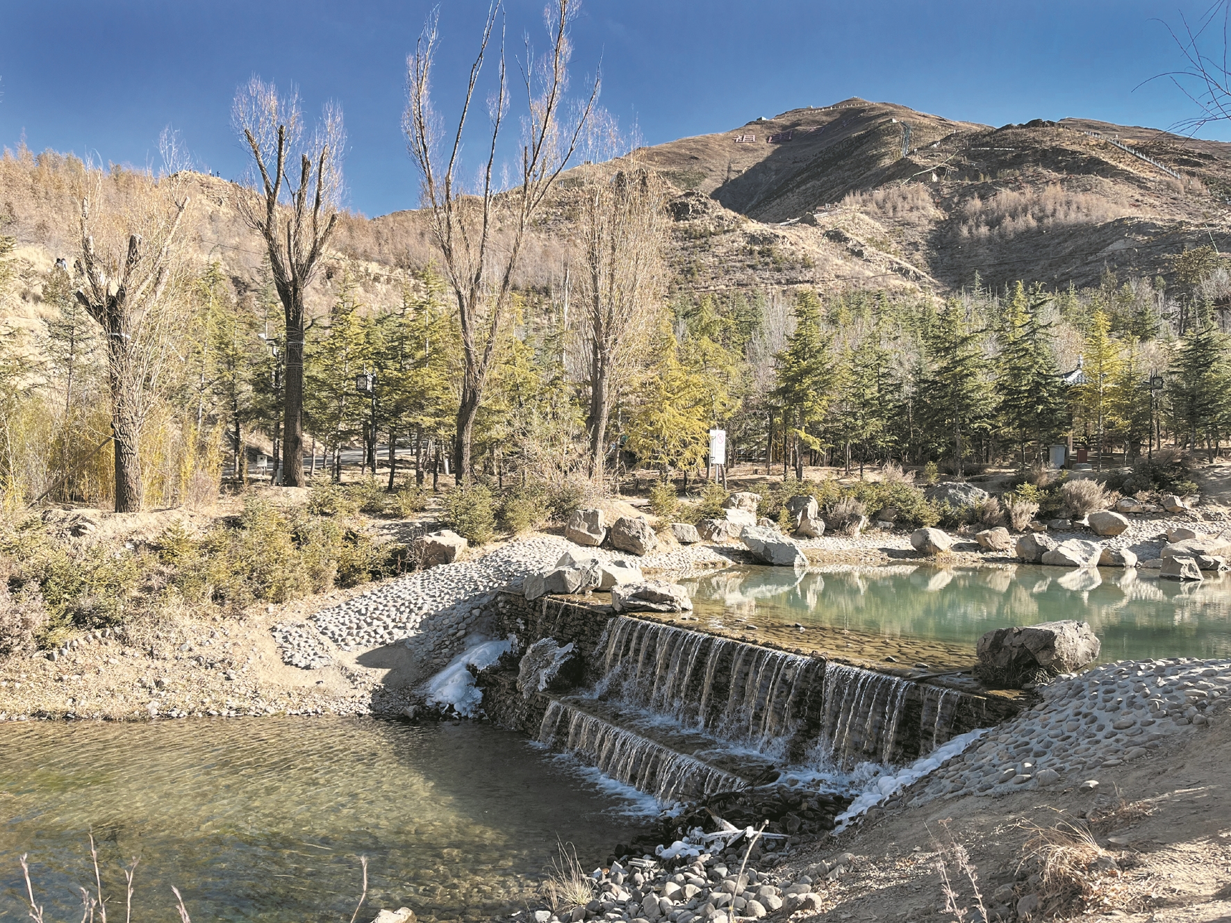 除了宗角祿康公園,位于布達(dá)拉宮正南方的南山公園也是冬游拉薩的不二選擇。山上灌木叢生,橋下流水叮咚,這便是冬日里的拉薩南山公園。得益于“樹(shù)上山”工程的成功實(shí)施,如今一年四季的南山公園都是成片的松柏和叮咚的泉水,這些都使園區(qū)具有別樣的冬日美。