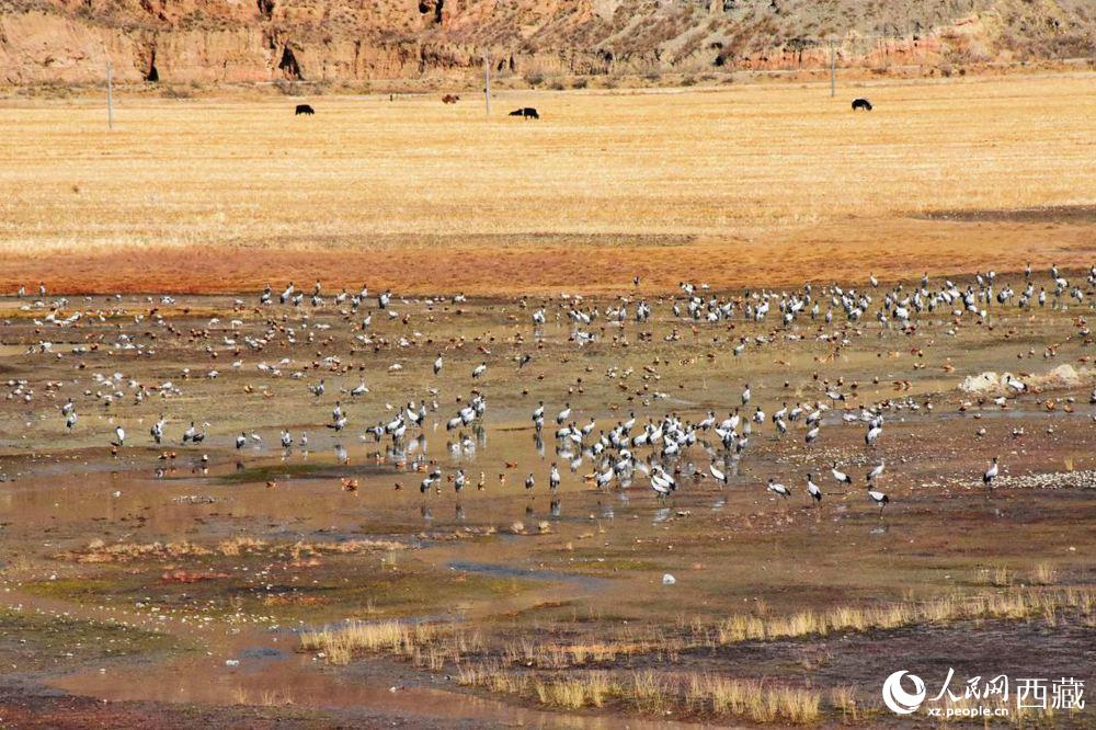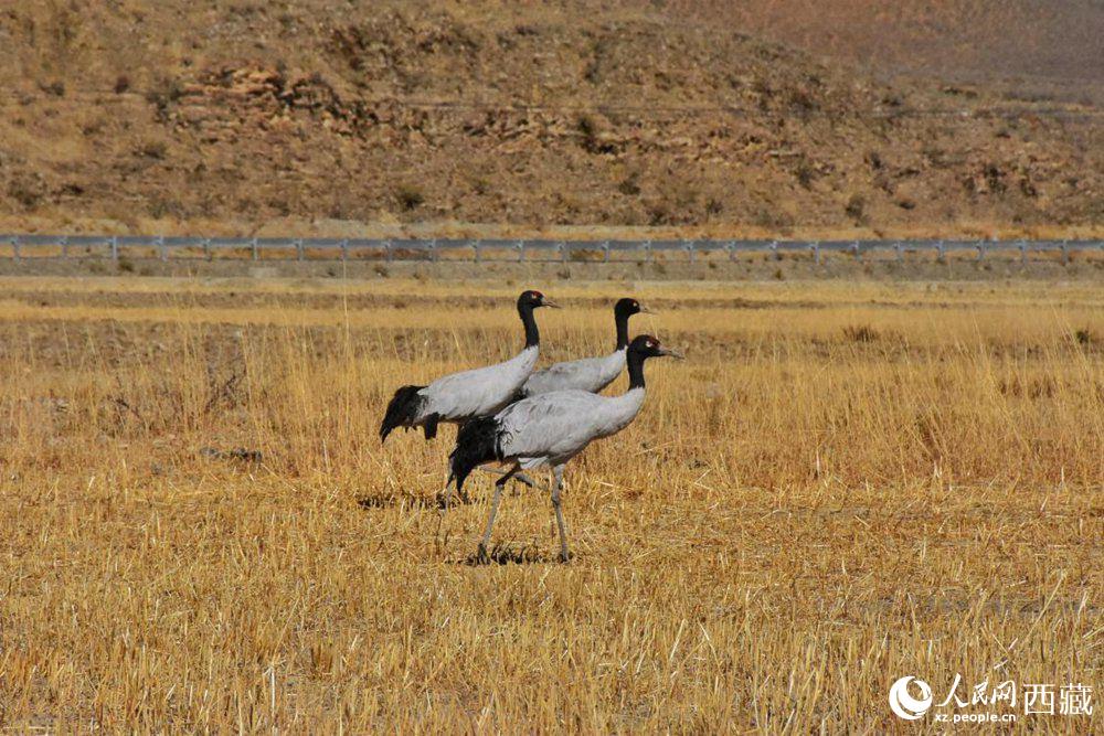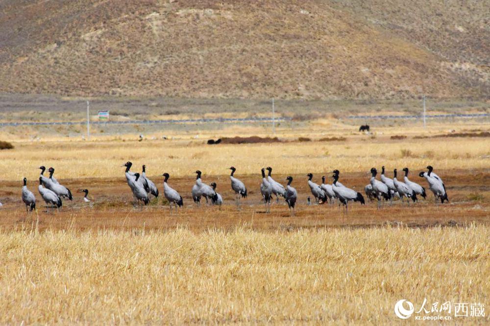 黑頸鶴在收割完的青稞地。人民網 李海霞 攝