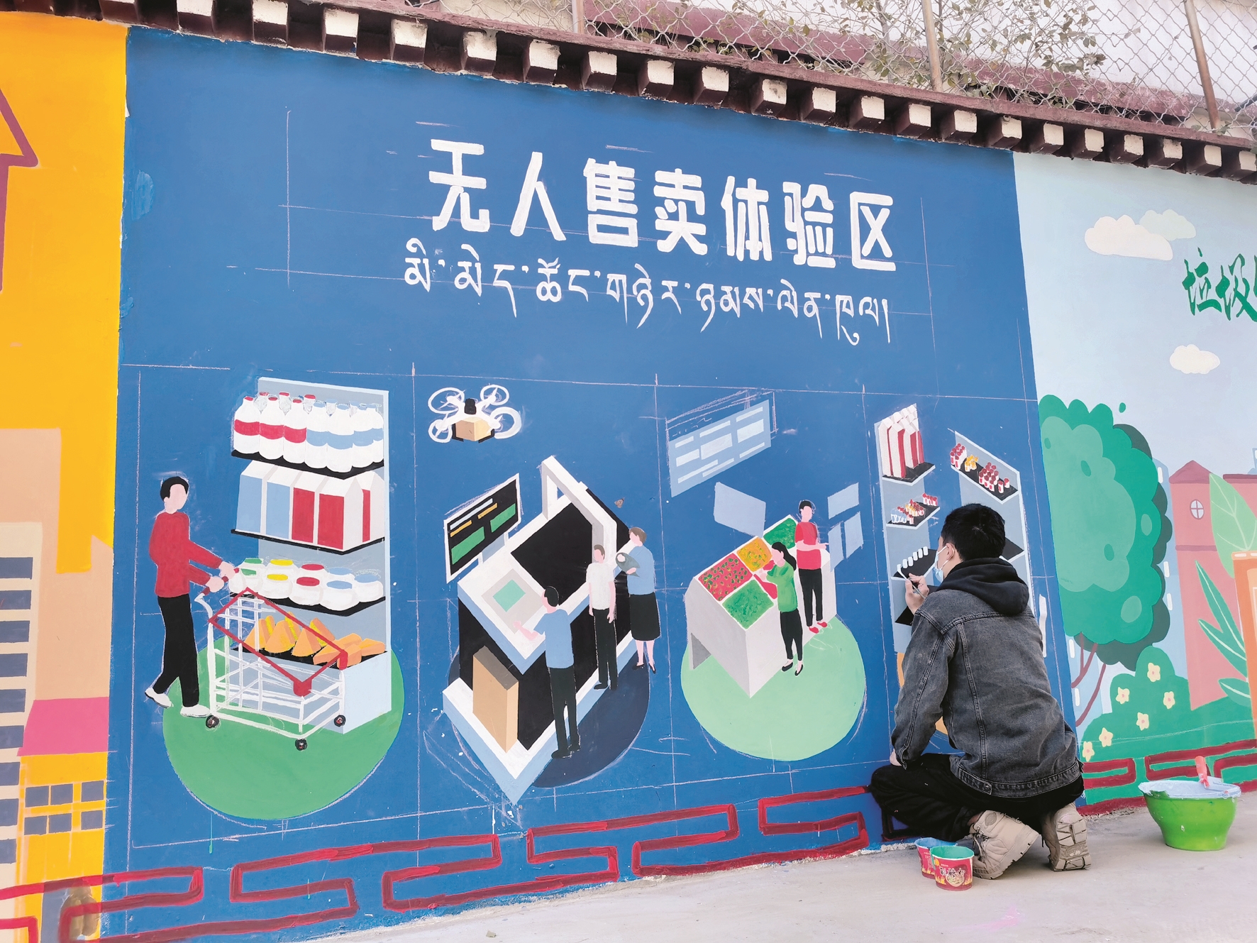 圖為工作人員正在對繞賽社區(qū)哈達(dá)巷進(jìn)行墻繪。拉薩融媒記者 范江英攝