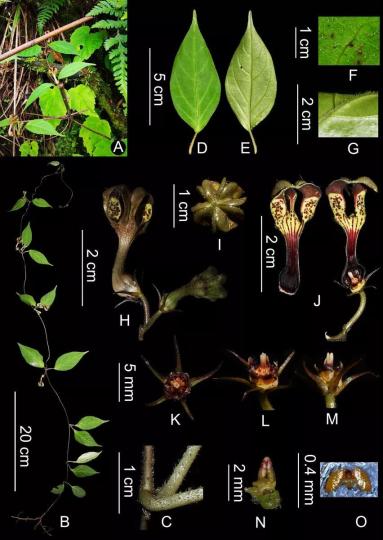 2021年7月中旬至8月初,由西雙版納植物園星耀武研究員率隊的聯(lián)合考察隊,對西藏日喀則地區(qū)喜馬拉雅南坡的維管植物進(jìn)行了考察和標(biāo)本采集。考察人員在吉隆縣薩勒鄉(xiāng)發(fā)現(xiàn)一種正處于盛花期的吊燈花屬未知植物。通過解剖拍照、文獻(xiàn)查閱及相似種的模式標(biāo)本核對后,最終確認(rèn)為一新種。根據(jù)其模式產(chǎn)地,將其命名為吉隆吊燈花(Ceropegia jilongensis)。