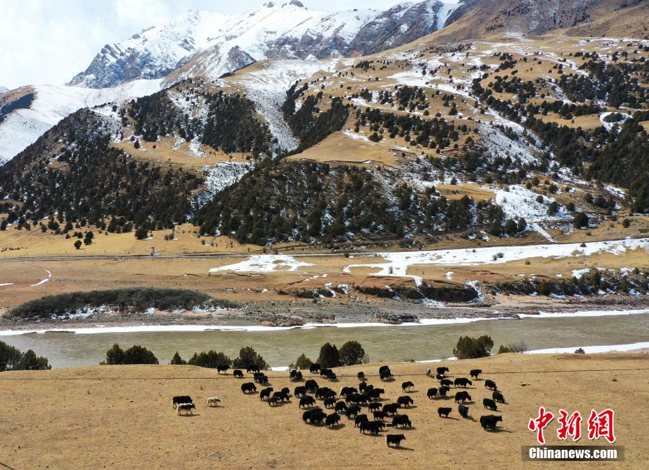 2月27日,一場降雪為青海省玉樹藏族自治州三江源國家公園瀾滄江源園區(qū)披上銀裝,藍(lán)天白云,雪山江河,牦牛在金燦燦的高山草場上悠閑散步,形成一幅幅多彩的生態(tài)美景圖。馬銘言 攝