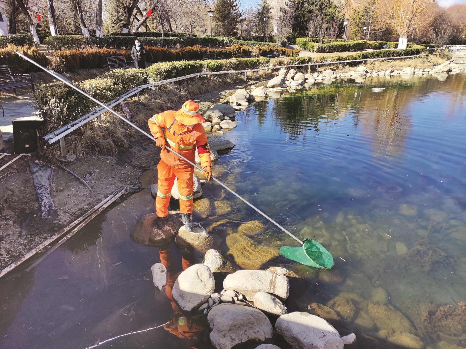 圖為布達(dá)拉宮廣場(chǎng)管理處工作人員手持長(zhǎng)柄網(wǎng)兜打撈水里的垃圾。拉薩融媒記者 趙耀鐵攝