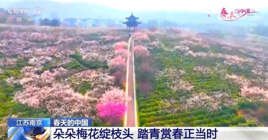 在江蘇南京傅家邊村,梅花星星點(diǎn)點(diǎn),陸續(xù)綻放。梅樹(shù)下間植茶樹(shù),白色、粉色的梅花與碧綠的茶樹(shù)相映成趣,遠(yuǎn)處青瓦白墻的江南民居若隱若現(xiàn)。登高遠(yuǎn)望,云蒸霞蔚,美景盡收眼底。
