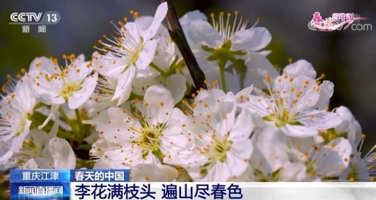 跟隨鏡頭,我們來(lái)到重慶江津區(qū)黑灘村,這里的千畝李花正開(kāi)滿枝頭。花蕊爭(zhēng)相生長(zhǎng),花瓣盡情舒展,遠(yuǎn)觀如滿樹(shù)雪霜,近賞又清新淡雅。漫山春花芬芳動(dòng)人,吸引游客紛至沓來(lái)。
