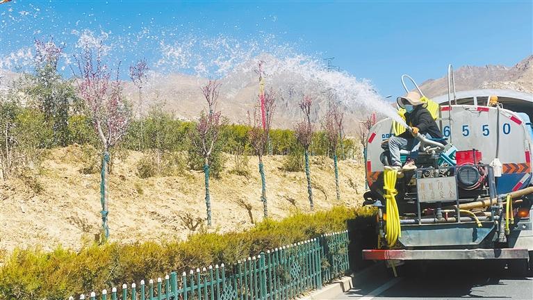 相關(guān)工作人員在為路邊樹木澆水。 記者 格桑倫珠 實習(xí)生 達娃宗巴 攝