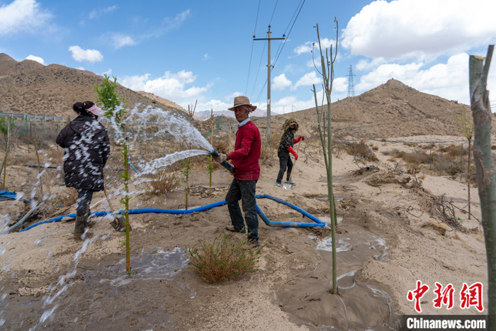 4月還是西藏的植樹(shù)季。記者沿雅魯藏布江而上,在桑耶寺上游十余公里處,松卡村十余位農(nóng)牧民正在一片荒灘上挖坑、栽種楊樹(shù)、澆水?!斑@個(gè)地方去年就開(kāi)始種樹(shù)了,沙地種樹(shù)太難,一些樹(shù)沒(méi)有成活,今年再補(bǔ)種?!必?fù)責(zé)澆水的扎西杰布說(shuō),該荒灘被一家綠化公司承包,他們是受雇于公司。