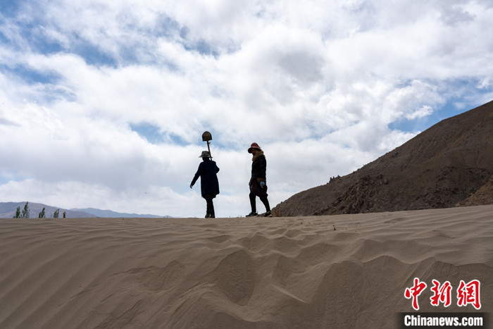圖為4月18日,西藏雅魯藏布江畔的農(nóng)牧民植完樹(shù)后行走在一處沙丘上。 中新社記者 江飛波 攝